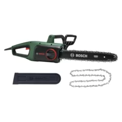 De kettingzaag UniversalChain 40 met snoer, licht met een gewicht van 4,3 kg en ergonomisch ontworpen voor maximaal gebruikersgemak. Een krachtige motor van 1800 W met een kettingsnelheid van 12 m/s zorgt voor snelle zaagprestaties. Het compacte Bosch SDS-systeem maakt het mogelijk om de ketting zonder extra gereedschap en eenvoudig te spannen en onderhouden. Een groot oliereservoir aan de zijkant met een handige dop met bandje garandeert gemakkelijk bijvullen van het automatische kettingsmeersysteem. Een robuuste terugslagrem garandeert een volledige kettingstop voor veiligheid. Deze kettingzaag is gemakkelijk te gebruiken en wendbaar, zodat hij ideaal is voor het zagen van houtblokken, takken en kleine tot middelgrote bomen.