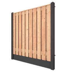 Voor het tuinscherm kun je kiezen tussen twee soorten materialen: geïmpregneerd grenenhout of douglashout. Iedere schutting staat uit 19 planken en dankzij de dichte opbouw, zorgt het scherm voor zowel veel privacy als een hoge windbelastbaarheid. Zoals op de afbeelding te zien is, wordt het scherm verticaal geplaatst. Bij een aanschaf vanaf 5 meter aan houtbetonschutting, kan er ook een extra element toegevoegd worden zoals een gaasscherm, een hoog- of laag scherm en een schuin aflopend scherm.