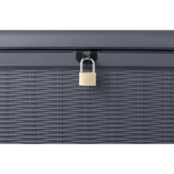 De kussenbox Borneo van Keter is de ideale oplossing om snel en gemakkelijk spullen op te bergen. Met zijn wicker design is deze opbergbox niet alleen zeer praktisch maar ook erg stijlvol waardoor je de box zowel binnen als buiten kan gebruiken. Met zijn grote opslagcapaciteit van 400 liter, is deze berging uitermate geschikt voor tuinkussens, speelgoed of andere tuinspullen. Dankzij de 2 gasveren kan je het deksel gedempt openen en sluiten. Daarnaast kan je deze opbergbox ook gebruiken als bankje. Dankzij het extra verstevigd deksel kunnen er gemakkelijk twee mensen zitten op de Borneo opbergbox.