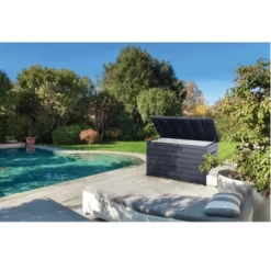Deze Keter Ontario opbergbox voor buiten heeft een elegante look van houten panelen. De kunststof kussenbox is weersbestendig en onderhoudsvrij. In de extra grote opbergbox met een capaciteit van 870 liter kan je de grootste lounge kussens kwijt. U kunt de box afsluiten met een slot voor extra veiligheid en hij houdt dat uw spullen droog en geventileerd.