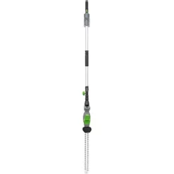 De heggenschaar heeft een zwaardlengte van 510 mm met een maximale snijdikte van 16 mm. De maaikop kan vast worden gezet op zes verschillende hoeken: -60°, -40°, -20°, 0°, 20° en 40°. Voor het gebruikscomfort is de telescopische heggenschaar uitgerust met een softgrip handgreep en een riem.