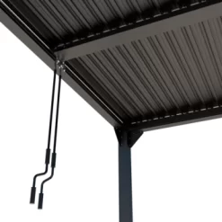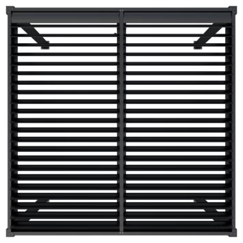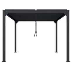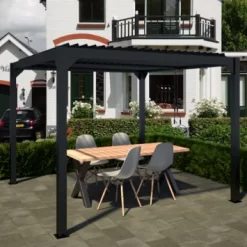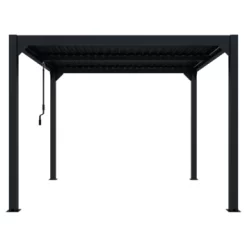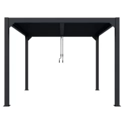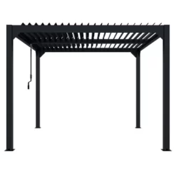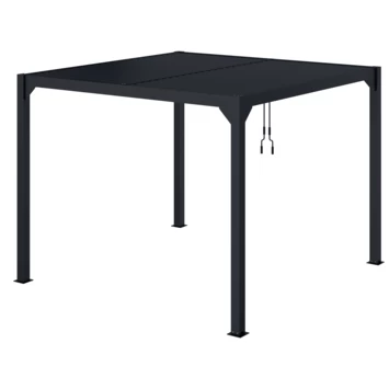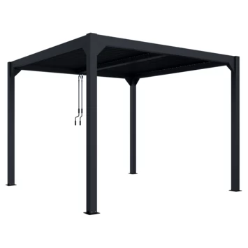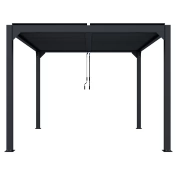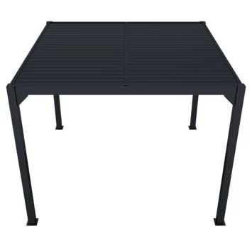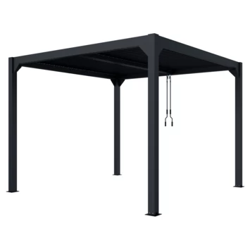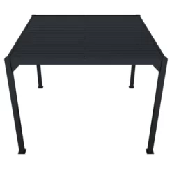 De Pergola Rodrigo is gemaakt van aluminium met een antracieten poedercoating. De afmeting is ca. 300×300 cm. Het voordeel van een aluminium pergola is dat deze onderhoudsvrij zijn in vergelijking met een houten pergola.