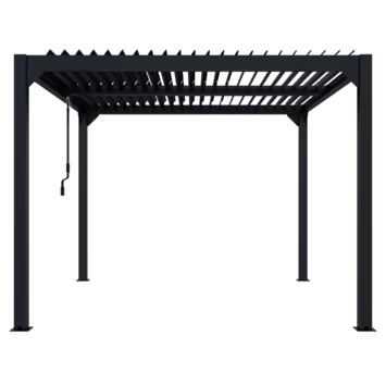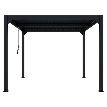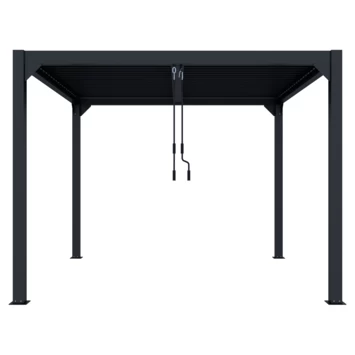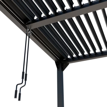 De pergola heeft een verstelbare schutterdak met draaibare lamellen, deze kunnen open of dicht gedraaid worden met een draaistang. Door deze dicht te draaien ben je beschut tegen de zon en is deze gelijk spat waterdicht bij regen. Deze kan ook open gedraaid worden op zonnige dagen. De twee helften op het dak kunnen afzonderlijk van elkaar versteld worden.