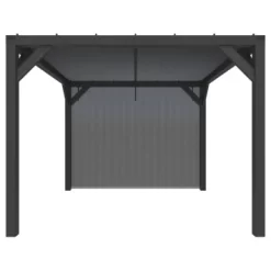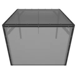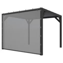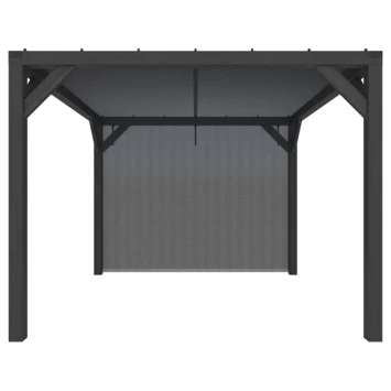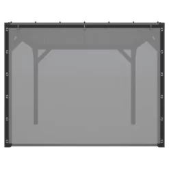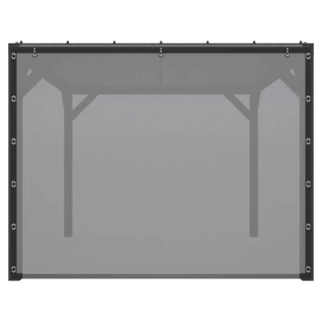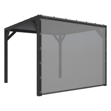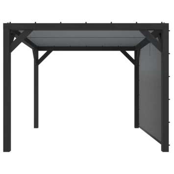 Pergola Silvano zwart gespoten vuren met zonweringdoek en zijdoek is 256 cm hoog, 328 cm breed en 324 cm diep, afhankelijk van de kant waar het zijdoek wordt bevestigd. De pergola heeft een stevige basis dankzij de halfhoutse hoekverbindingen en schoren. De robuuste staanders van 12 x 12 cm geeft de pergola een stoer karakter. Het kwalitatieve schaduwdoek biedt bescherming tegen de zon. Het zwart doek heeft een lichtgrijze en een donkergrijze kant. Je kunt zelf bepalen welke zijde je boven en onder plaatst, beide opties zijn mogelijk. Je kunt het schaduwdoek gemakkelijk bevestigen met zeilogen en knoppen. Het zijdoek wordt aan de bovenzijde bevestigd met een caravanrail en aan de zijkanten met zeilogen en knoppen. De 3 oprolriempjes aan de bovenzijde van het doek zorgen ervoor dat het doek tijdelijk kan worden opgerold. Zowel het doek aan de bovenzijde als aan de zijkant kunnen s ’winters er af worden gehaald, voor een langere levensduur.