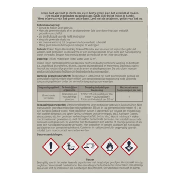 | Voorzorgsmaatregelen | GEEN braken opwekken. BIJ CONTACT MET DE OGEN: voorzichtig afspoelen met water gedurende een aantal minuten Bij het inwinnen van medisch advies, de verpakking of het etiket ter beschikking houden. NA INSLIKKEN: onmiddellijk een ANTIGIFCENTRUM/arts/… raadplegen. Buiten het bereik van kinderen houden. Verwijderd houden van warmte, hete oppervlakken, vonken, open vuur en andere ontstekingsbronnen. Niet roken. Achter slot bewaren. Beschermende handschoenen/beschermende kleding/oogbescherming/gelaatsbescherming dragen. Inhoud/verpakking afvoeren naar … |