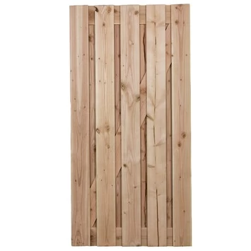 Met deze poort maak je een mooie toegang naar jouw tuin. Vooral in combinatie met het tuinscherm Douglas zal dit erg fraai staan. Maar je kan deze poort natuurlijk ook gebruiken in combinatie met een schutting in een andere kleur of houtsoort voor een speels effect. De poort is gemaakt van ruw Douglas hout en dient voor extra bescherming direct gebeitst te worden. De tuindeur bestaat uit 9 planken van ca. 15 bij 140 millimeter, die zijn bevestigd met RVS-schroeven. De poort heeft een standaard maat van ca. 180×90 cm en biedt gemiddelde privacy. Deze tuindeur kan zowel links- als rechtsdraaiend worden geplaatst. Bevestigingsmateriaal dient apart te worden aangeschaft.