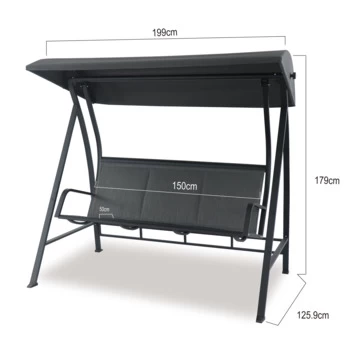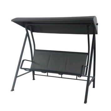 In de schommelbank Montreal kan je het hele jaar door zorgeloos schommelen, want het polyester dak beschermt je tegen directe zon en lichte regenval. Het stevige frame is gemaakt uit zwart staal. De bank zelf bestaat uit een bank van zwart aluminium dat bekleed is met textileen: een zacht maar stevig materiaal dat snel droogt voor extra comfort. De bank is ideaal voor 2 volwassenen of 3 kinderen. Het dak en de bekleding zijn antraciet van kleur, wat voor een tijdloze look zorgt.