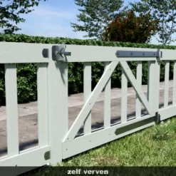 De poort is gemakkelijk te bevestigen tussen 2 palen. Gebruik hiervoor 2 duimhengen met verzet. Deze dient 20cm korter te zijn dan de totale lengte van de poort. Bevestig de hengen met een slotbout en houtboutschroeven aan de poort. Bevestig op de palen de (verstelbare) duimen op de zelfde hoogte. Vervolgens kan de poort gemakkelijk in de duimen geplaatst worden. Bevestig vervolgens een boerenklinkstel op de poort en paal om netjes de paal te kunnen sluiten.